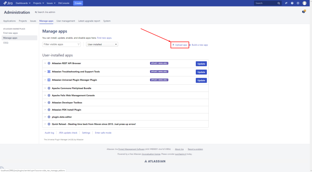 To update the Rublon Jira MFA Plugin to the latest version, you need to go to the Manage apps tab of Administration in your Jira server. Then, find Rublon Multi-Factor Authentication (MFA), and if an update is possible, you will see the Update button, as shown in the picture below.