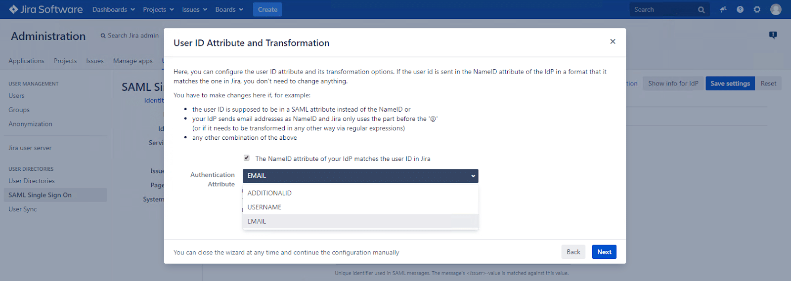 13. The SAML Single Sign On for Jira plugin allows adding new users to Jira, but you do not need this option in your configuration, because you synchronize users with Microsoft Active Directory instead. Select Update from SAML-Attributes and click Save & Next.