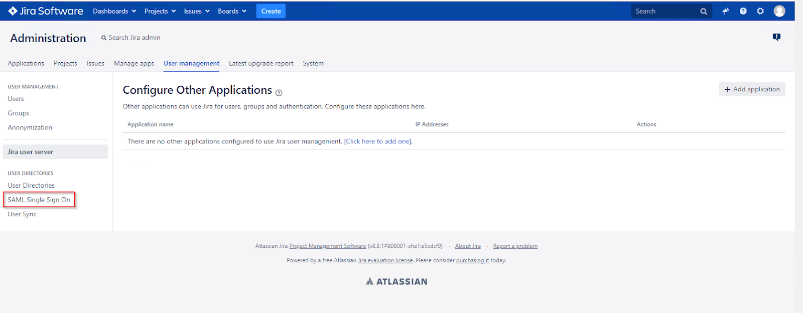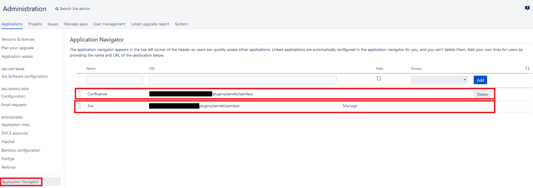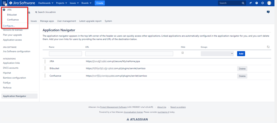 Atlassian products allow you to quickly switch to another Atlassian application by adding URL links in Application Navigator. Adding links using SSO mechanisms allows you to switch between applications without having to log in again. This section portrays the configuration in Jira. Application Navigator works similarly in Confluence Server and Bitbucket Server.