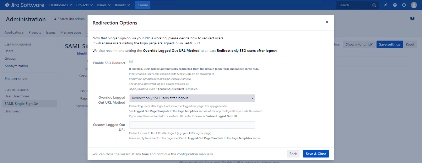 17. The last window asks about redirect options. Select Enable SSO Redirect, so that the standard Jira login will be redirected to the Single Sign On login. Ensure that Single Sign On works correctly before doing this! Click Save & Close.