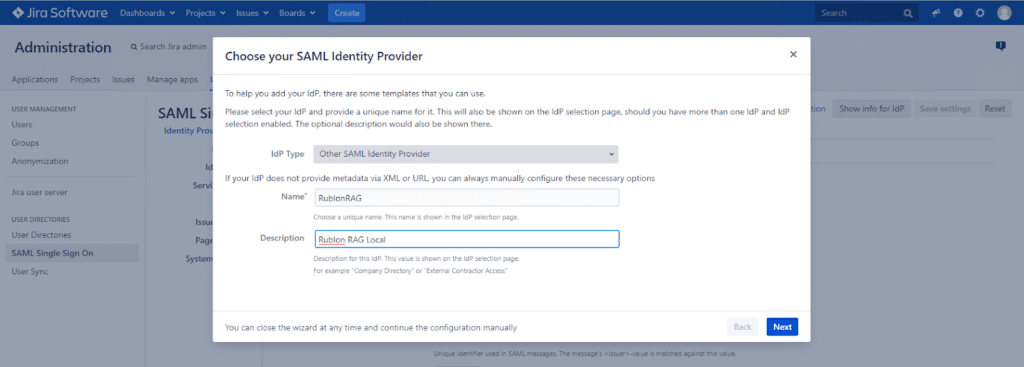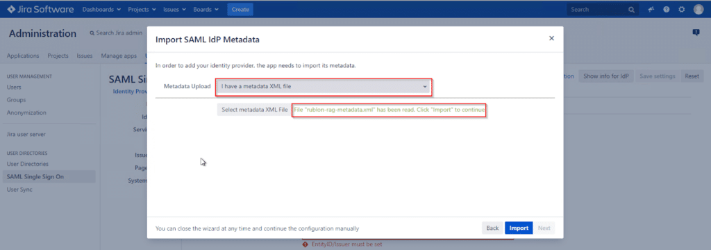 11. Get back to Jira. Import the metadata XML file you downloaded from Rublon Access Gateway. Select I have a metadata XML file. Select your file. Click Import. Click Next.