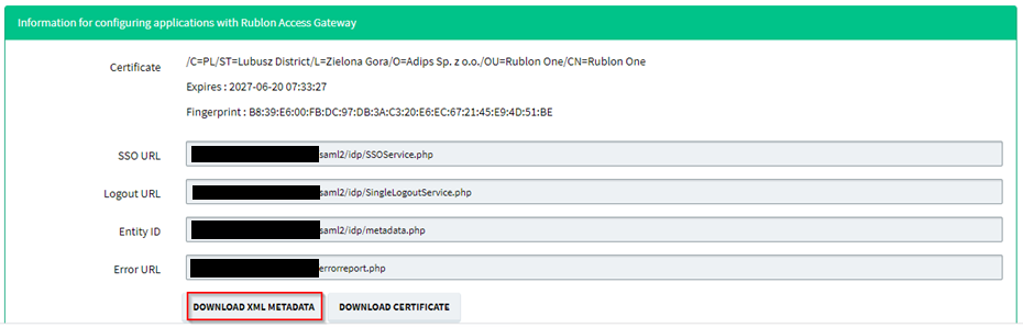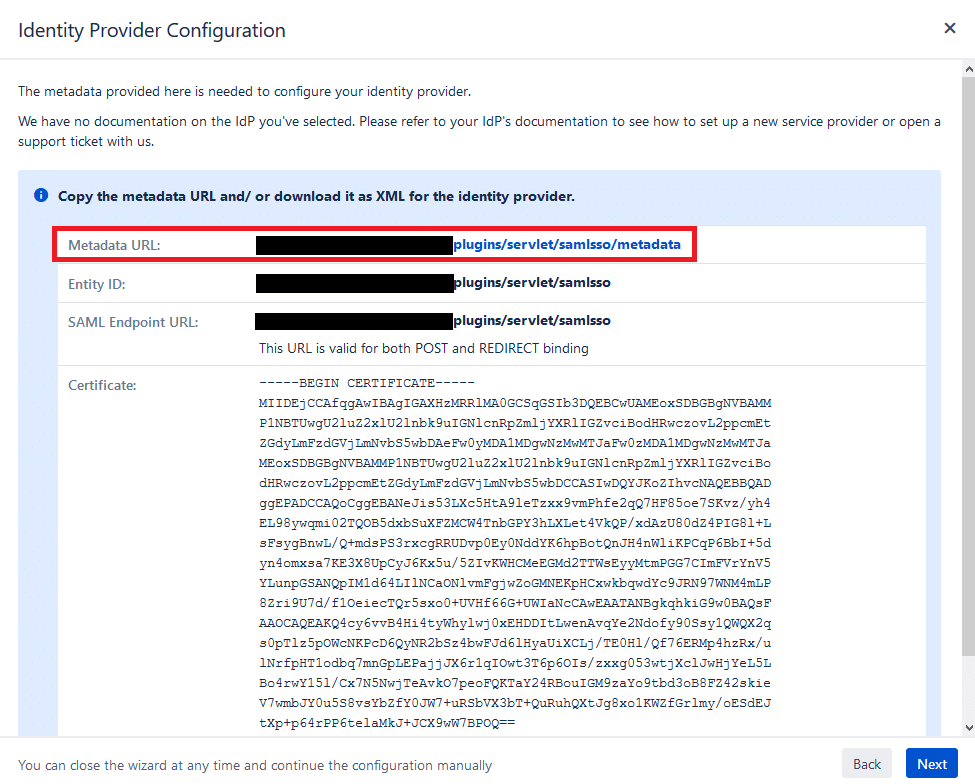 6. Save the XML file from Metadata URL. You are going to need it later. Click Next.
