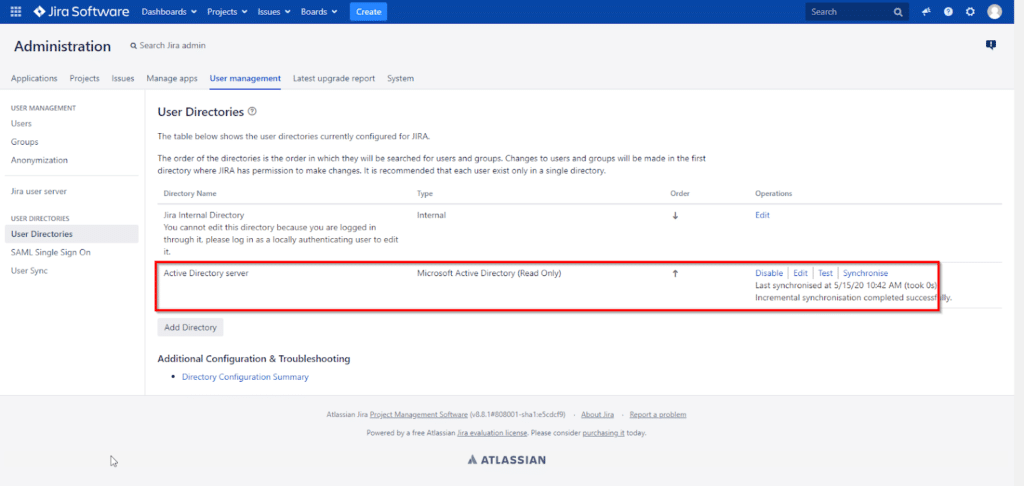 6. After a successful test, click Back to directory list. You should see your Active Directory server listed under User Directories.
