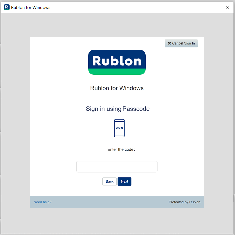 SMS Passcode. Rublon sends you a message with a passcode. Verify your identity by entering the passcode on Rublon Prompt.