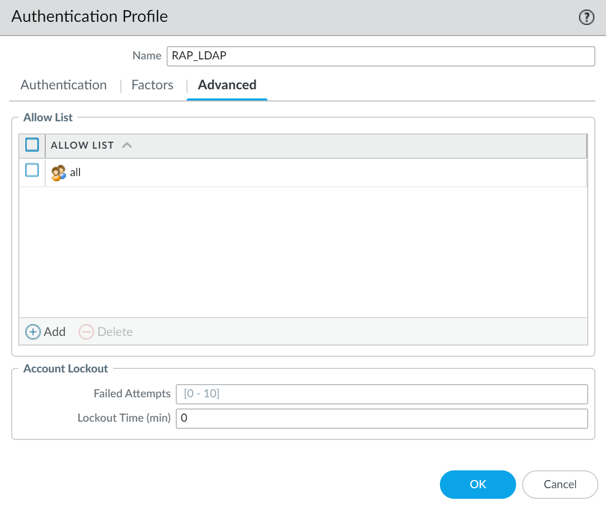 | Name | Enter a name for your authentication profile, e.g., RAP_LDAP. |