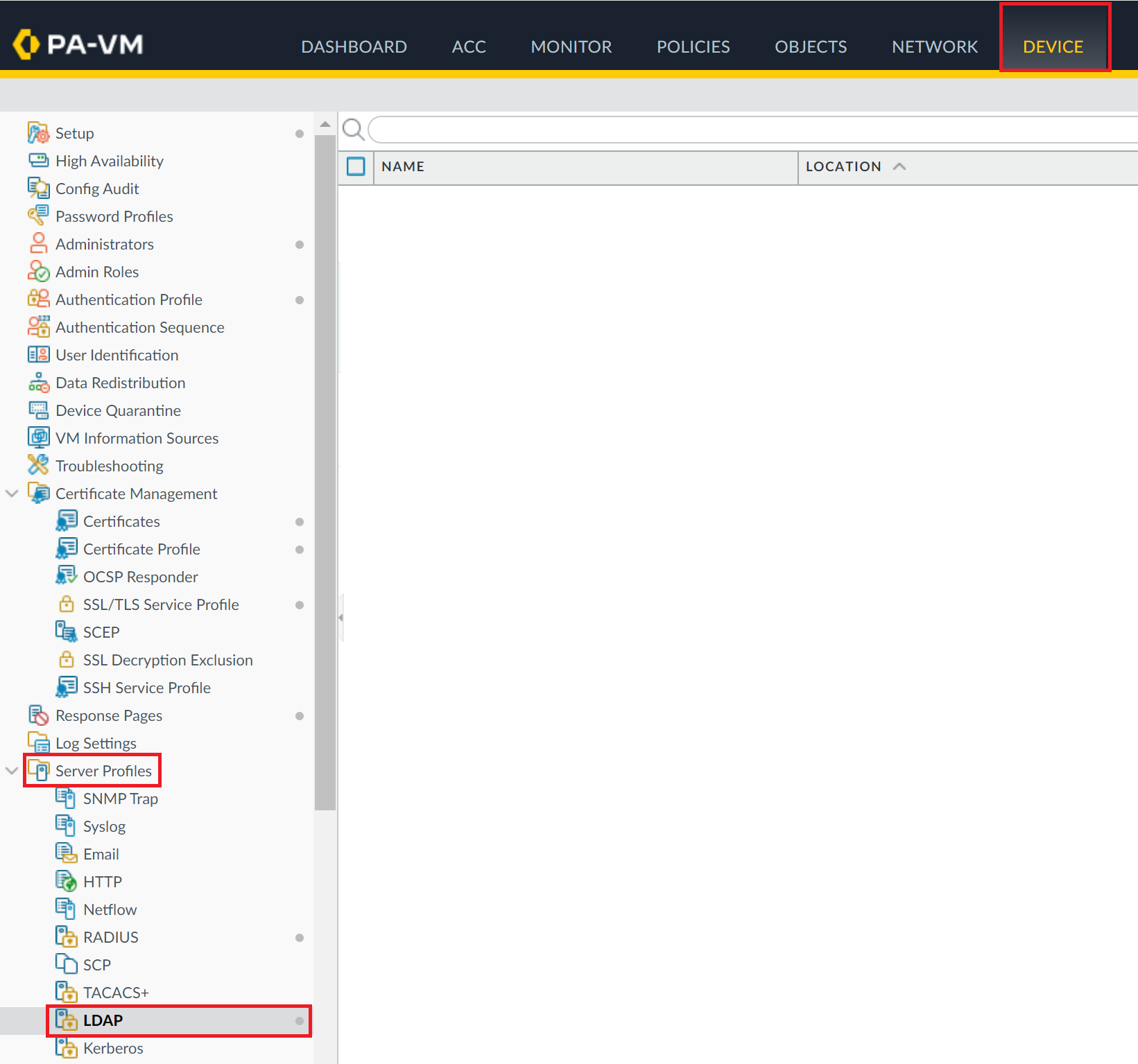 2. Select the Device tab and then select Server Profiles → LDAP.