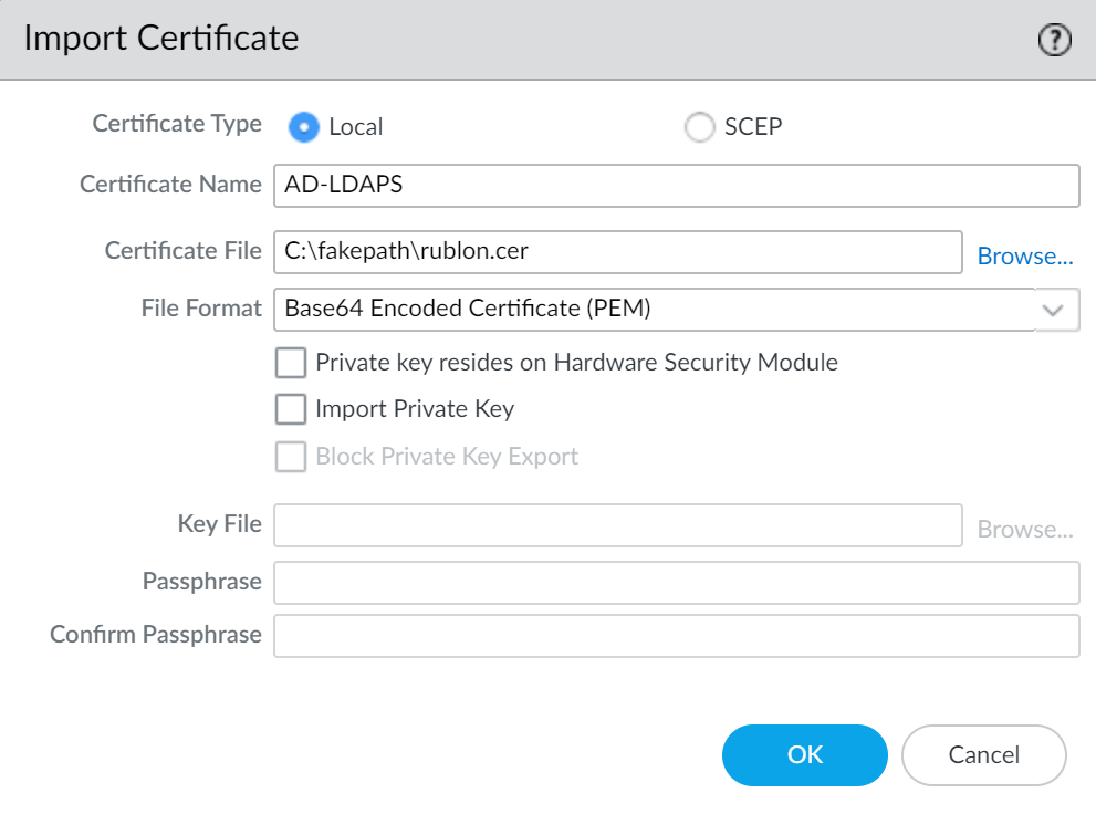 2. Fill in the form with the information about your certificate. It can be a Local or SCEP certificate. You also can (but do not have to) import a private key file, in which case you will have to enter the passphrase, too.