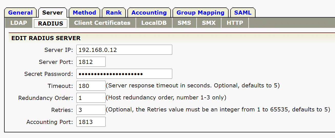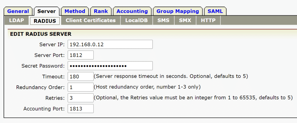 | Redundancy Order | 1 (assuming this is your first RADIUS server) |