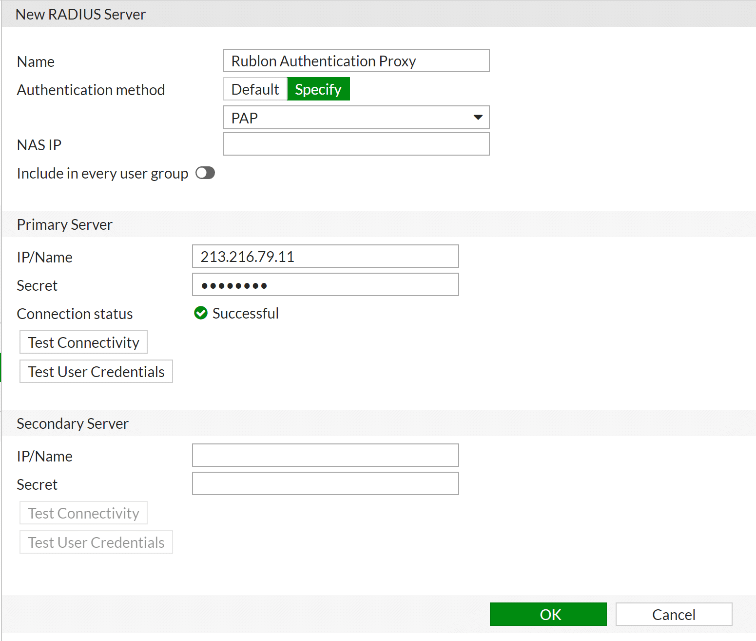 | Primary Server Secret | Enter the RADIUS Secret set in Rublon Authentication Proxy. |