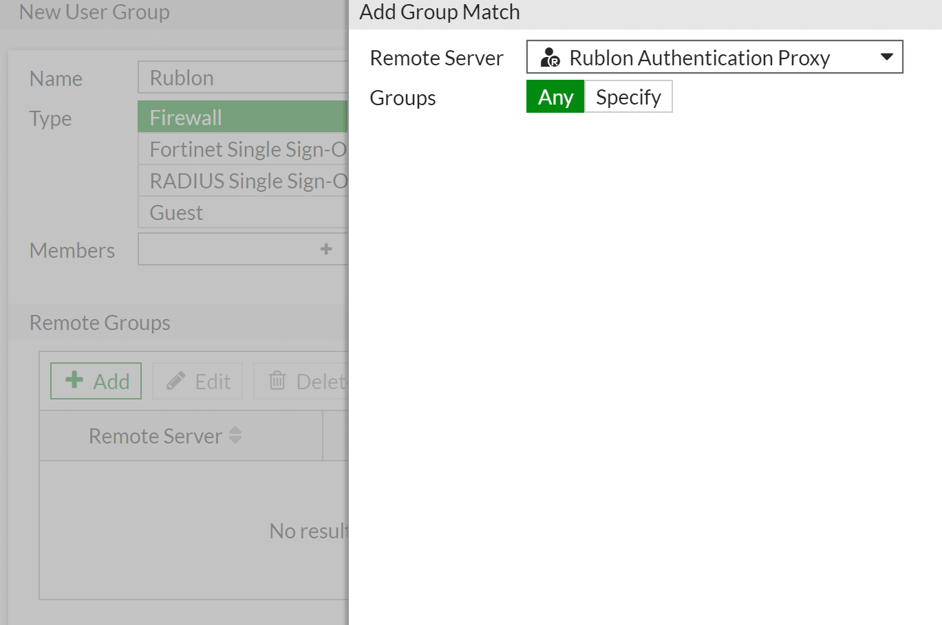 3. Click the Add button in the Remote Groups section. In Add Group Match, select the Rublon Authentication Proxy remote server. You do not have to specify a group. Click OK to add the remote server.