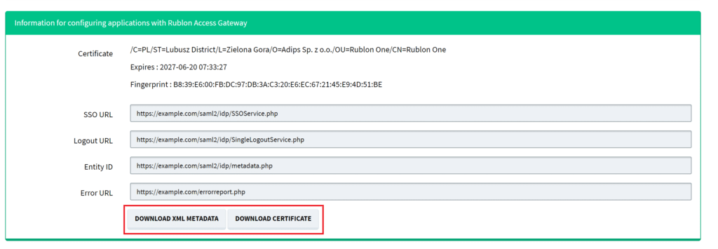 17. Click DOWNLOAD XML METADATA in the Information for configuring applications with Rublon Access Gateway section.