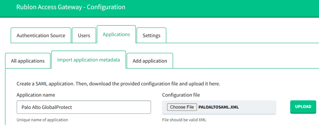6. In Rublon Access Gateway, go to Applications → Import application metadata.