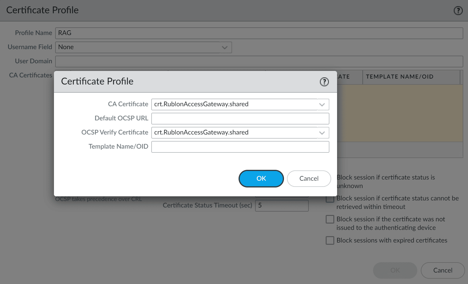 11. Under CA Certificates, click Add. Then, select the certificate imported from Rublon Access Gateway in the CA Certificate and OCSP Verify Certificate fields and click OK.