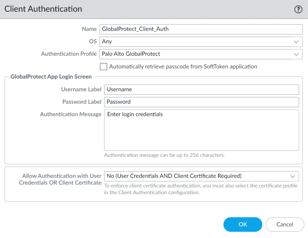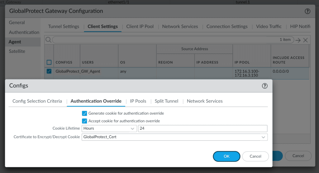 - Accept cookie for authentication override (this option requires you to select the SSL certificate imported to GlobalProtect)