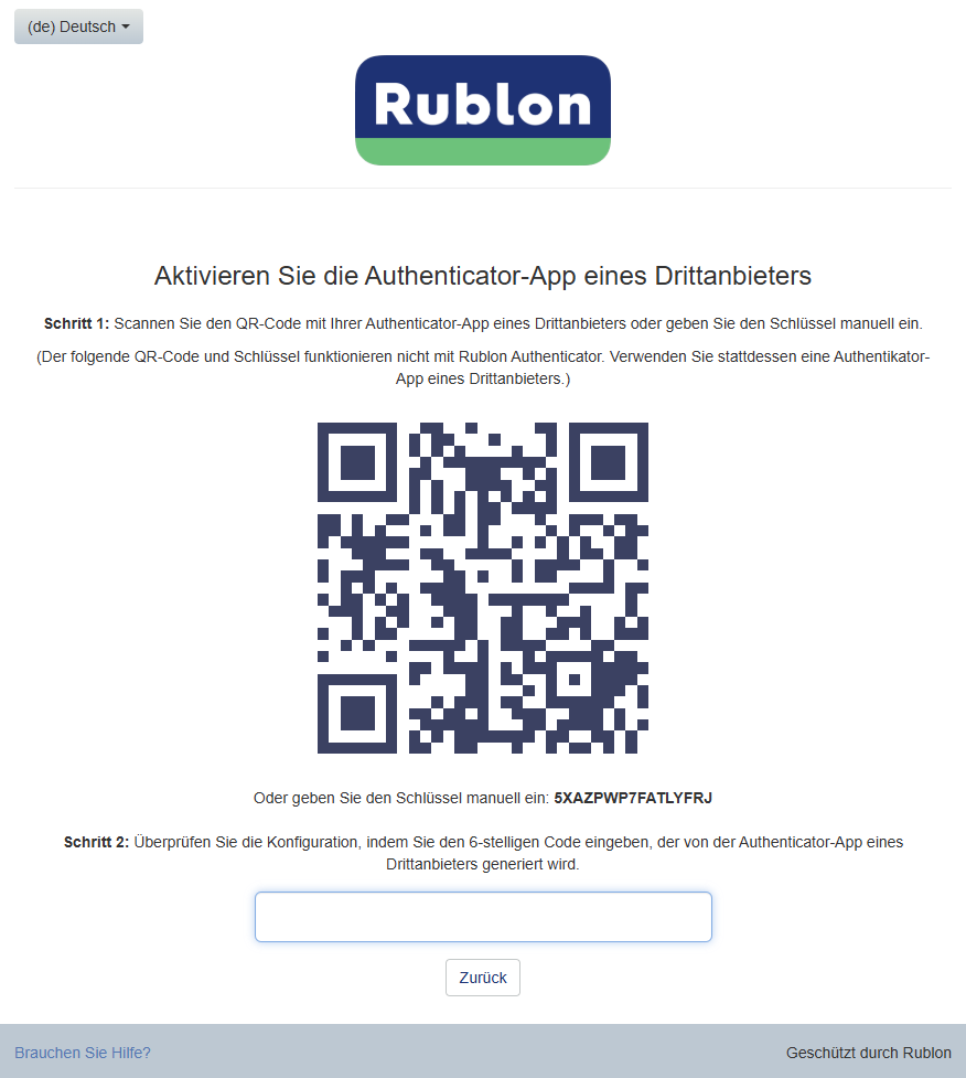 Hinweis: Wenn Sie eine Anleitung zur Registrierung der Rublon Authenticator Mobile App suchen, siehe Wie registrieren Sie ein mobiles Gerät mit Rublon Authenticator?. Der Rublon Authenticator bietet ein höheres Maß an Sicherheit und mehr Authentifizierungsmethoden als TOTP-basierte Apps von Drittanbietern.