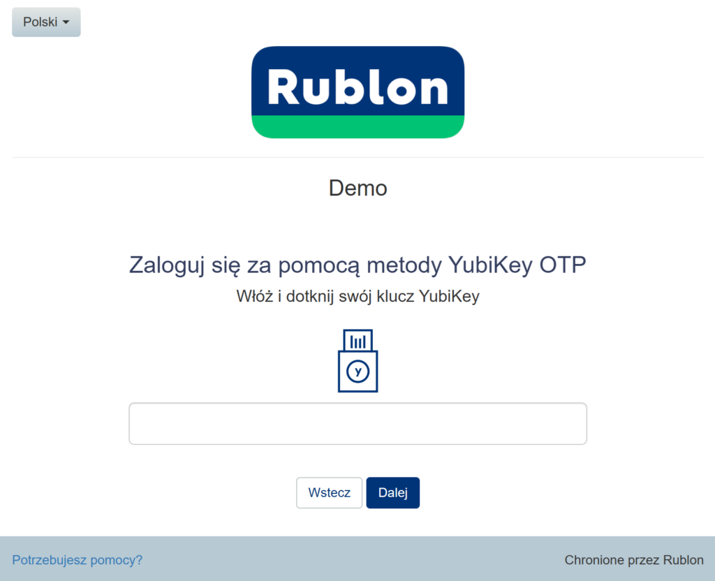 System uwierzytelniania wieloskładnikowego Rublon MFA obsługuje klucze bezpieczeństwa YubiKey OTP, umożliwiając logowanie za pomocą hasła jednorazowego (OTP) z najwyższym poziomem bezpieczeństwa. Poniżej znajdują się instrukcje, jak zarejestrować klucz bezpieczeństwa YubiKey OTP i używać go do logowania do aplikacji.