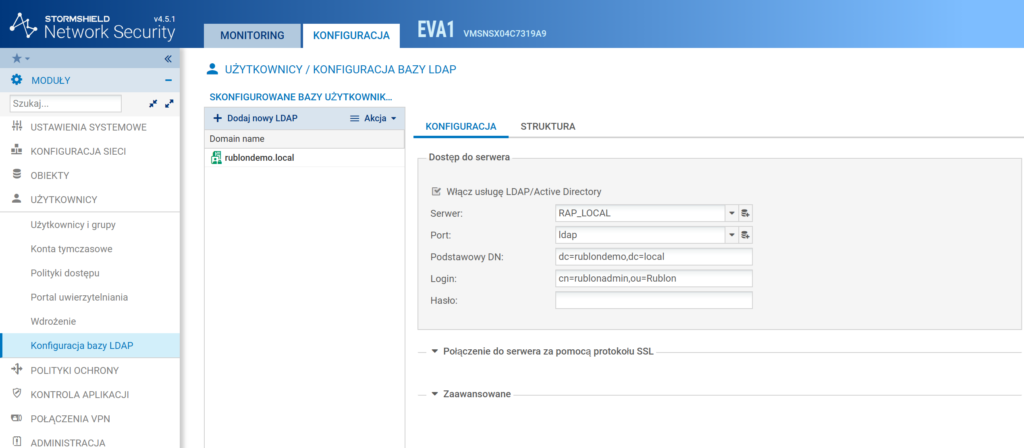 | Login | Login (cn) konta, które się będzie uwierzytelniało do LDAP. Uwaga: W przeciwieństwie do innych integracji, w których użytkownik jest określony w pełnej notacji CN LDAP (np. Cn=rublonadmin,ou=Rublon,dc=rublondemo,dc=local), w przypadku Stormshield wystarczy podać tylko połowę CN bez dodawania domeny. Zatem dla powyższego przykładu należałoby podać: Cn=rublonadmin,ou=Rublon. |