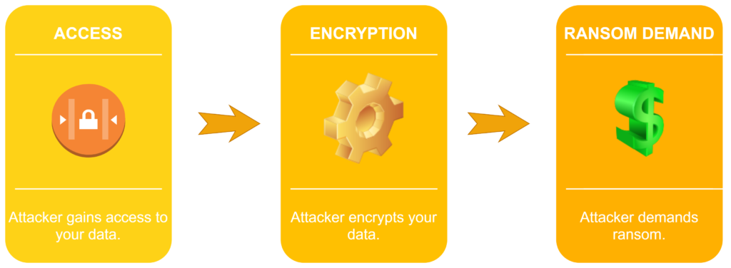 Ransomware is a type of malware that encrypts your files, making them inaccessible. First, a malicious actor gains access to your system and encrypts your data. Then, the malicious actor demands a ransom in exchange for the decryption key.
