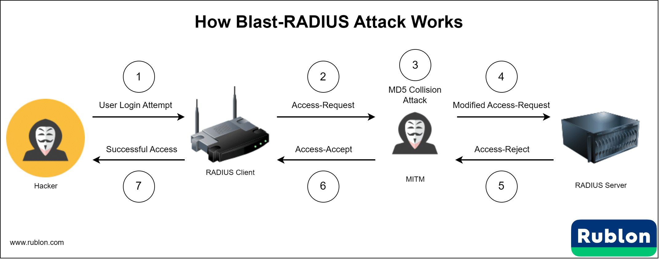 - Modified Access-Request: The attacker adds gibberish to the Access-Request disguised as a Proxy-State attribute.
